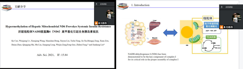 随后,刘老师分享了题为《肝脏线粒体NADH脱氢酶6ND6)高甲基化引起全身胰岛素抵抗》的文献。指出,目前还没有研究充分描述ND6相关调节网络在疾病发病机制中的详细机制,这篇文章揭示了2型糖尿病患者ND6高甲基化与胰岛素抵抗之间的新联系,证实了糖尿病患者ND6的特异性高甲基化会导致ND6表达抑制和线粒体功能障碍以致全身胰岛素抵抗。刘老师详细讲解了文献中所用到的研究思路、研究方法,包括细胞实验及动物实验检测指标的选取、相关基因敲低或过表达的方法、细胞器分离及免疫荧光标记等内容。刘老师还表示,这篇文章对于做机制研究提供了很好的参考。