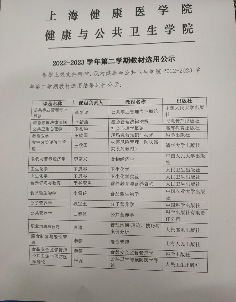 根据上级文件精神,现对永利304官网唯一2022-2023学年第二学期教材选用结果进行公示: