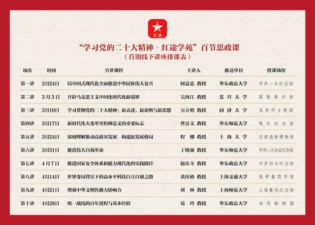 未来,“红途学苑”大思政课线下首批精品讲座将继续于每周五下午,在13个国家级爱国主义教育示范基地陆续开展,并进行线上直播。由复旦大学等7所高校知名专家教授带来主题多元的课程宣讲。目前线下讲座排课表和第一季课程目录已发布,公众可前往“红途”平台红途学苑专区进行预约报名。
