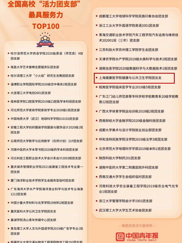 近日,共青团中央、中国青年报公布2022年度高校“活力团支部”评选结果。在校党委的坚强领导下,学院党总支和校团委的指导下,自2022年5月以来,永利304官网唯一团总支经校内选树、上海市标杆活力团支部推选、全国终审等环节,最终获评2022年度全国高校“活力团支部”最具服务力TOP100。