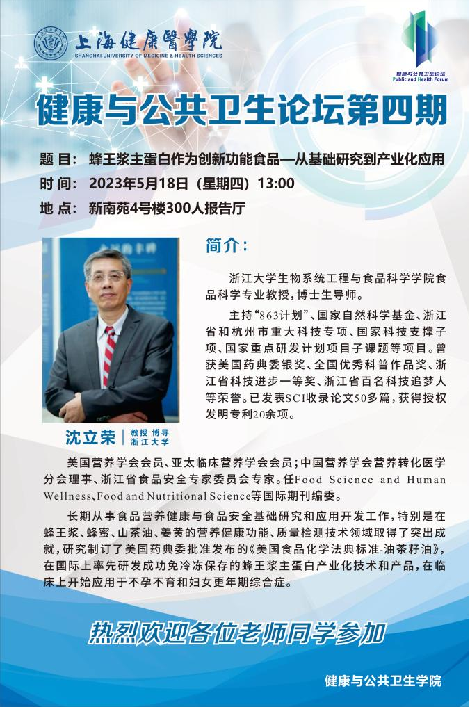 健康与公共卫生论坛第四期开讲,本次邀请到浙江大学生物系统工程与食品科学学院食品科学专业沈立荣教授做题为“蜂王浆主蛋白作为创新功能食品—从基础研究到产业化应用”的讲座。