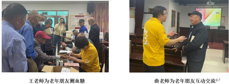 宣讲过后,王丽华老师带来了便携式的血压计和血糖仪,并为老年朋友测定了血糖,并解答稳定血糖的日常注意事项。朱礼华老师带领学生们为老年朋友测定血压并与他们互动交流。整个进社区活动持续90分钟,老年朋友们积极性很好,围着几位老师咨询生活中遇到的营养健康问题,社区负责老师对我们这次活动给予了很高的评价,希望我们能经常来,丰富老人朋友的精神生活。