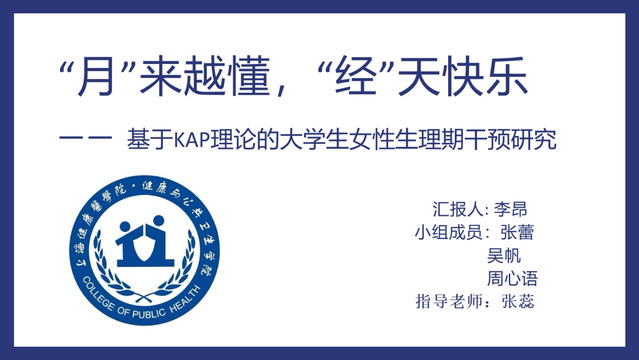 李昂同学和她的团队成员带来的是“‘月’ 来越懂,‘经’天快乐——基于KAP理论的大学生女性生理期干预研究”项目。该项目从KAP理论出发,围绕女性生理期对大学生开展干预研究,从研究现状、研究目的、项目实施方案、创新之处、前期基础这五个方面进行介绍,预期将基于干预结果,完成一篇论文,为促进大学生群体两性友好发展,高校深入开展健康教育提供参考依据。