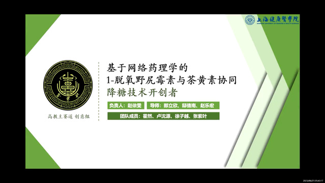 赵依雯同学和她的团队成员带来了“基于网络药理学的1-脱氧野尻霉素与茶黄素协同降糖技术开创者”项目。该团队创新性选择药食同源中药,探究其可能具有降糖能力的活性成分,研究复配效果,再结合临床试验获得的安全有效剂量,研发特殊营养食品配方,与企业合作研发产品。开创协同降糖技术,推广中药传承发展。