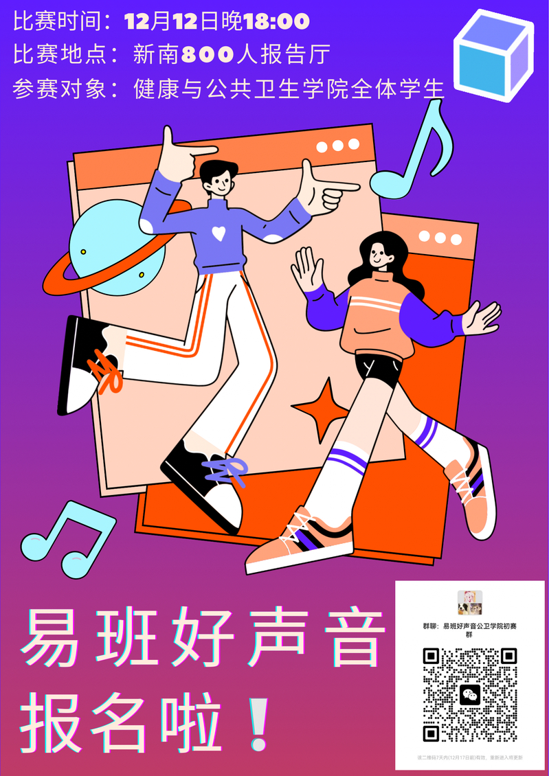 青春逐梦,唱响未来,为营造浓厚校园文化氛围,弘扬主旋律,传播正能量,让同学们能够更好展示自我,校易班开展“易班好声音”活动。永利304官网唯一学生会将于12月12日晚18:00,在新南苑800 人报告厅开展初赛选拔活动。本次活动旨在通过歌唱的方式,让青春的旋律响彻校园,希望的种子扬帆起航,让上健医学子展现独属于他们的魅力。