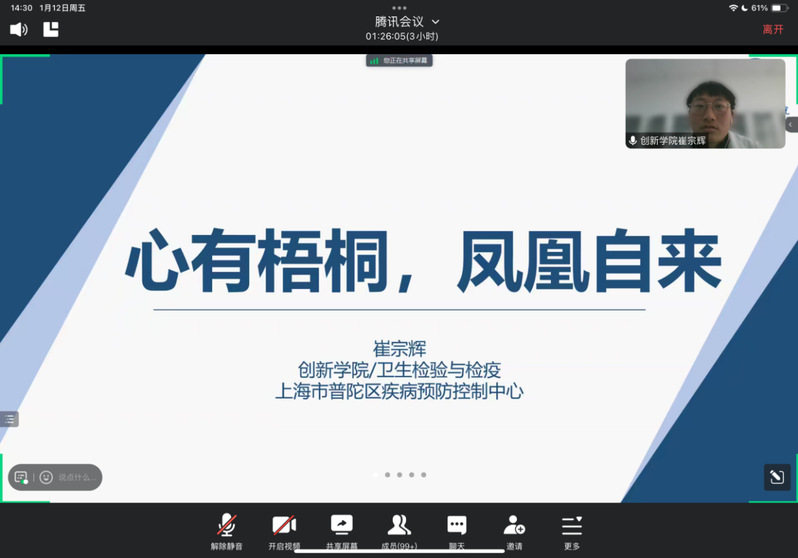 思创意以实践,积跬步以致远。为进一步推进健康与公共卫生学院学生的创新创业意识,激发同学们创新创业的热情,帮助培养同学们的创新意识,提高创新创业项目质量1月12日下午1点30分,健康与公共卫生学院与创新创业学院联合举办创新创业活动分享会,特邀上海市、区疾控中心宣讲团成员、上海市普陀区疾病预防控制中心第一团支部书记崔宗辉老师为同学们带来了主题为“心有梧桐,凤凰自来”的创新创业活动分享会,共计140余名师生共同参会