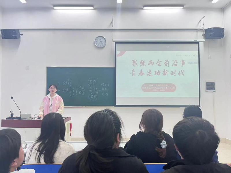 本次活动通过团支书桂萌萌同学向大家讲解此次团日活动的主要内容,通过专题文章和视频深入解析了中国两会在当前历史节点的特殊意义。今年不仅是中华人民共和国成立75周年,也是“十四五”规划关键的实施年,更是全国人民代表大会成立70周年的重要时刻。两会的召开具有特殊的纪念意义,我们要积极学习,及时了解国家实施的政策,更加关注国家未来的发展,将小我融入大我,自觉做推动国家发展的参与者和实践者。同时鼓励同学们积极参与讨论,探讨这些议案对我们青年人的意义。从关乎基础民生的粮食安全和教育负担问题,到养老助餐等养老领域的议题,再到生活中的细节,如增强电视内容的吸引力,这些议案无不体现了代表们对民情的深切关怀。