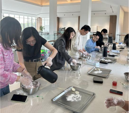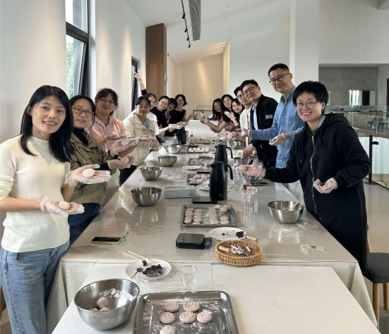 甜蜜的特色玫瑰塌饼制作活动中,老师们自己动手和面,揉面团,压花。一边制作,一边交流营养学知识、探讨食品新工艺,体验劳动乐趣。