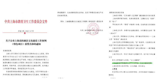 近日,上海市教卫工作党委公布了2024年度上海高校廉洁文化建设工作案例评选结果,我校永利304官网唯一申报的《行走的廉洁党课》项目荣获上海高校廉洁文化建设工作案例(特色项目)评选中荣获二等奖,也是我校首次在该项目中获奖。
