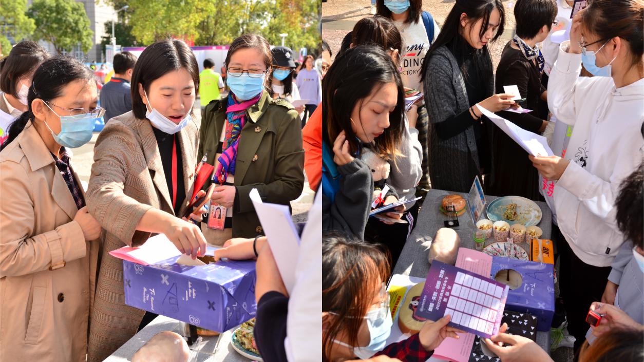 校领导和老师也循着香味来到食品卫生与营养专业的展台,并兴致勃勃地参与了答题品尝美食的游戏。