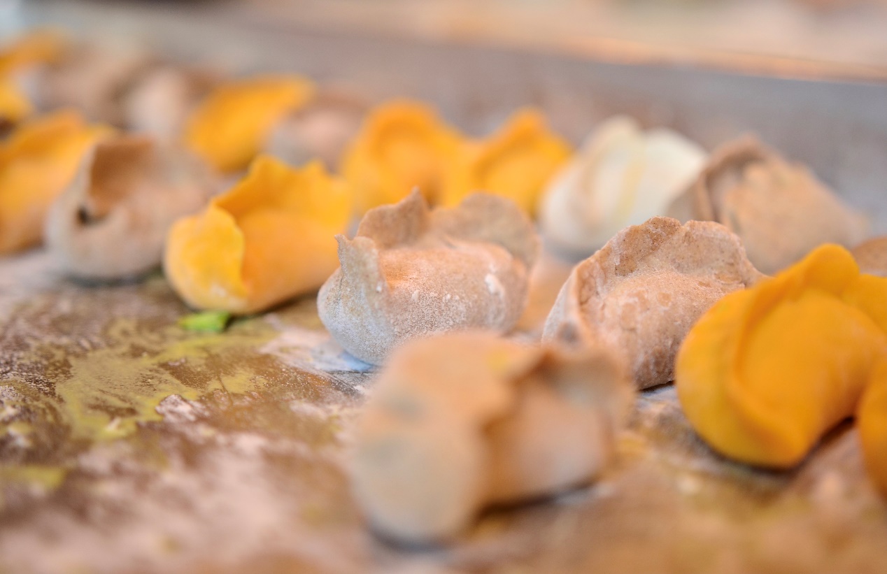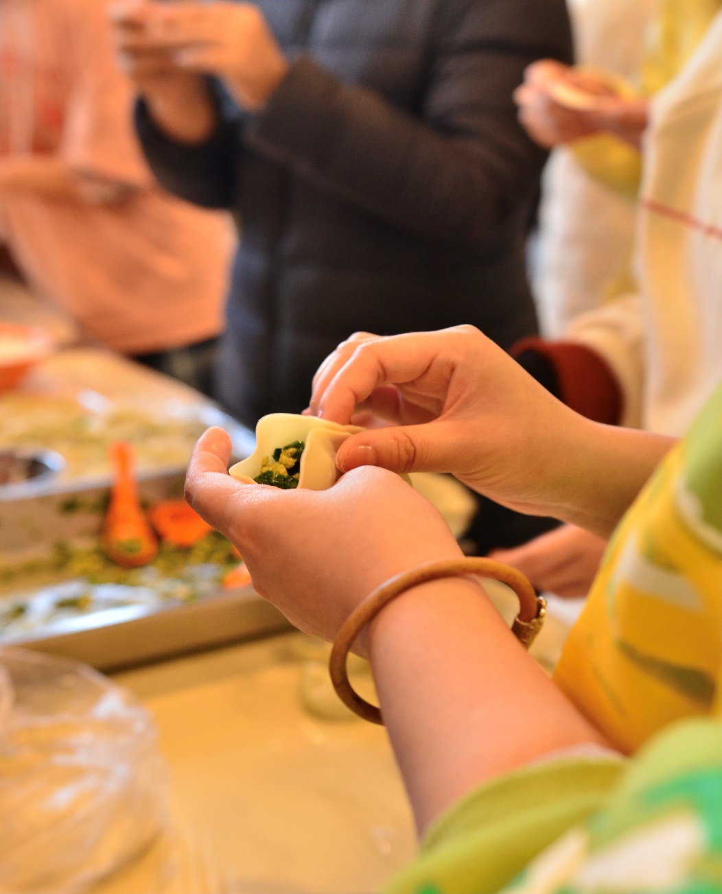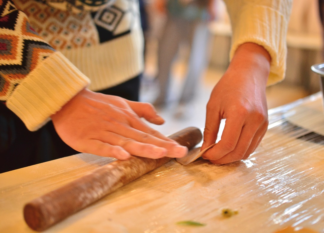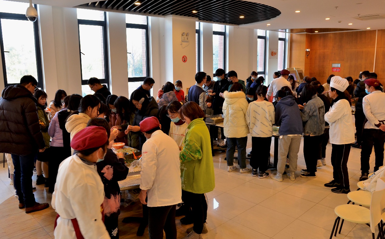 食堂里洋溢着浓浓的节日氛围,新南苑食堂的师傅们早早就为师生们准备好了包饺子的材料和用具。冬日的严寒丝毫没有阻挡老师和同学们包饺子的热情,大家围在长桌两侧挽起袖子,擀皮儿,包馅儿,紧张地忙碌起来。有的同学包的饺子个大饱满,有的同学包的饺子小巧精致,有的同学则一边包一边学,包出了许多形态各异的饺子。师生们一起,一边动手,一边聊着各自家乡的风土人情与风俗习惯,食堂里不时回荡着欢声笑语,气氛愉快而活跃。同学们感受到了家一般的温暖。