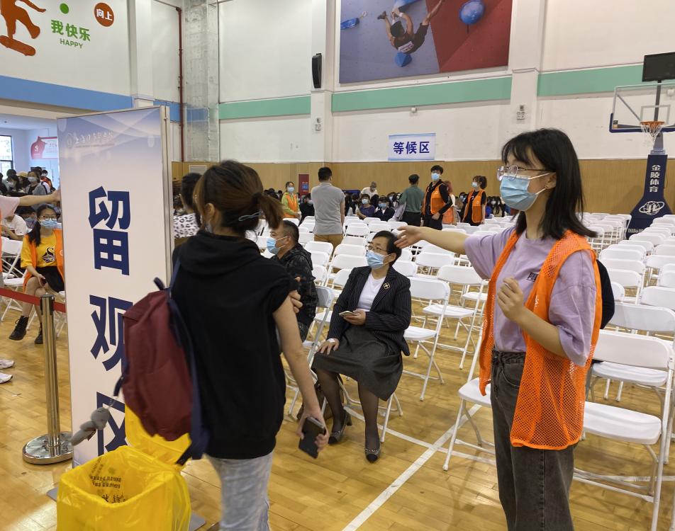 为了更好地提醒师生,志愿者录下温馨的语音提示:“同学们,请打开随申码,配合出示身份证、接种条码,接种武生苗的同学请在右侧台阶排队等候;接种科兴苗的同学请在左侧排队等候……”