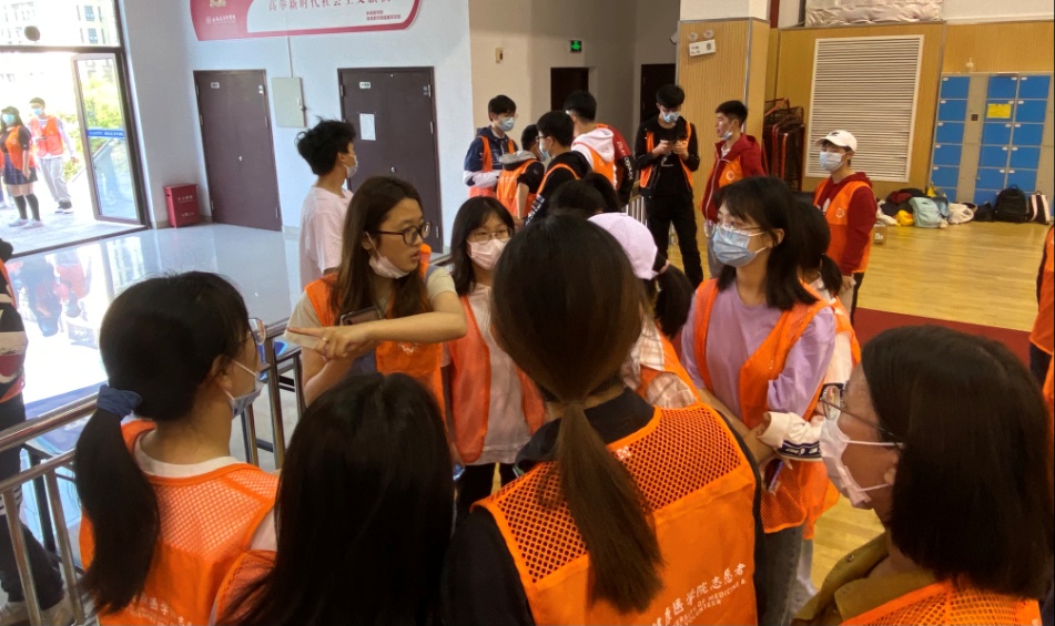 志愿者在班长周怡卿带领下,迅速根据资料检查区、引流区、接种区、留观区的场地布置,分为六个志愿服务组,并根据工作量的大小,进行了人员安排,和分组培训。要求一是志愿者相互配合,确保场地不拥挤、人流不堵塞;二是要有高度的责任心和使命感,服务好每一位现场的医生和来打针的师生;三是合理安排与调配,确保每位志愿者人人有责,人尽其责,同时又能根据现场情况,能够插空去打针、午餐、休息。