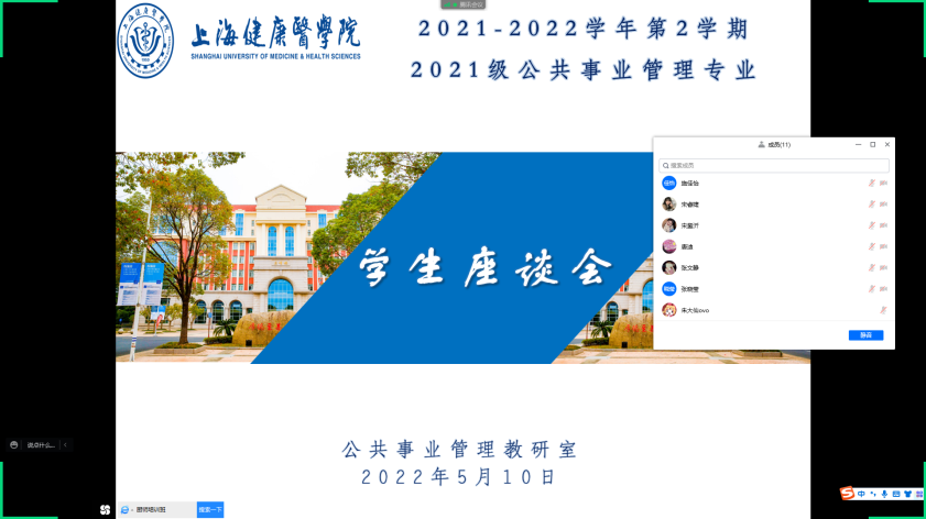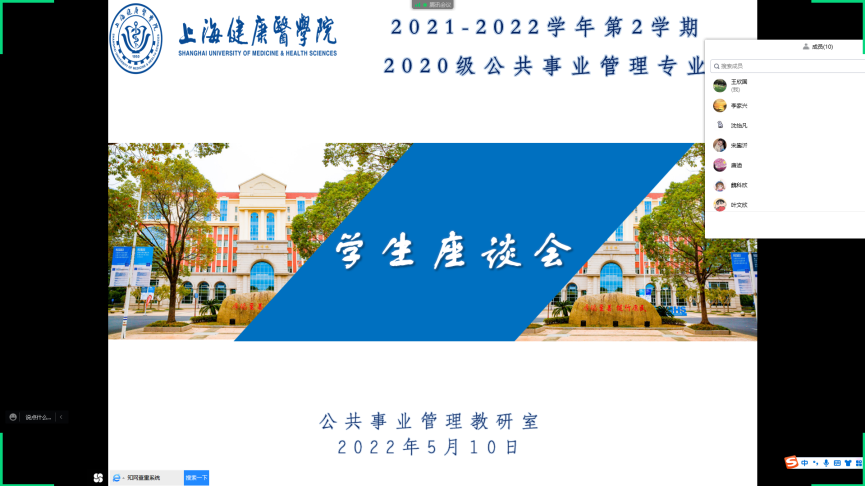 2022年4月27日至5月25日为学校2022年度上半年“教学质量月”。为了解本学期课程教学运行情况,及时发现和改进教学中存在的问题与不足,提高教学质量,5月10日晚7点,公共事业管理教研室在线分别组织召开了2020级和2021级公共事业管理专业本科生座谈会。公共事业管理教研室全体教师及两个年级学生代表近二十人参会。会议通过师生自我介绍、学生提问与教师解答等,围绕专业课程学习、学生个人发展、学生学习困惑等进行了沟通交流,教师们结合自身的学习经历分享了自己的经验。